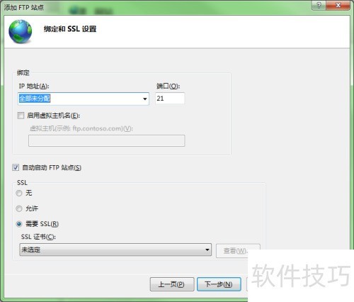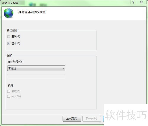 9、 在绑定和SSL设置界面,仅将SSL选项设为无,其余保持默认,点击下一步。进入身份验证和授权信息页面后,勾选基本身份验证方式,授权设置暂不配置,直接点击完成,即可成功添加。