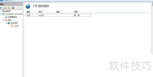 12、 返回主界面后,右侧会显示FTP授权规则选项,需添加之前创建的用户名。双击进入该规则设置页面,注意确认当前操作的是顶层(小地球)CCSOFT的FTP授权规则,而非其子级内容。随后右键点击空白区域,选择添加允许规则,在弹出窗口中按要求填写用户信息,确保准确无误后点击确定完成添加。成功后,规则列表中将显示新添加的信息。若需添加多个用户,建议逐一操作,避免出错,确保每个用户权限配置正确完整。