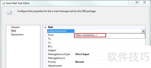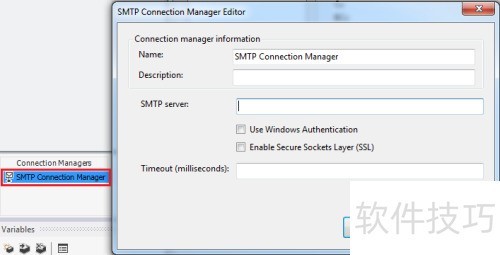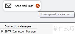 3、 进入Mail选项卡后,点击SmtpConnection下拉菜单,选择其中的选项,系统将自动弹出 SMTP 连接管理器编辑窗口。此时可观察到,在页面下方的连接管理器区域中,已成功添加了一个新创建的 SMTP 连接管理器,该管理器用于配置和管理邮件发送所需的服务器连接信息,为后续的邮件任务提供支持。