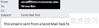 6、 重新启动编辑器后,在主题字段中填写发送邮件测试,然后在消息内容区域输入:此邮件由发送邮件任务发出,仅用于测试目的。完成输入后,点击确定按钮,系统将自动保存配置并运行程序包。随后,您将收到一封测试邮件。整个过程依赖于SMTP连接管理器,它负责与SMTP(简单邮件传输协议)服务器建立连接。发送邮件任务通过调用该连接管理器实现邮件的发送功能。此配置确保了任务能够正确地通过指定的邮件服务器传递信息,是验证邮件功能是否正常工作的关键步骤。通过这一流程,可有效检测邮件发送机制的可用性与稳定性。