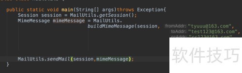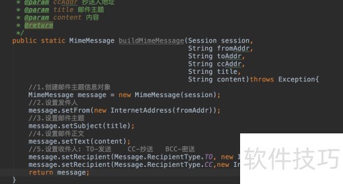 7、 通过Session对象创建邮件对象MimeMessage,设定发件人、收件人、抄送人邮箱地址,并配置邮件主题与正文内容,完成邮件信息的封装与初始化。