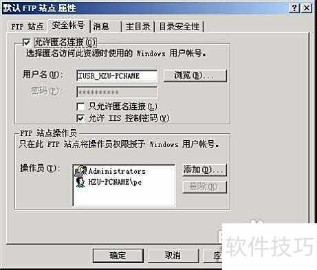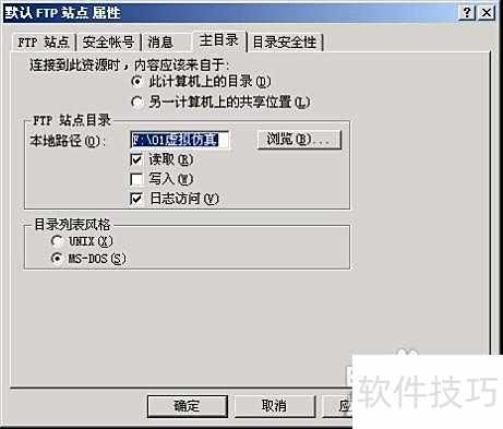 8、 在主目录选项卡中,需设定FTP服务器对外提供服务的主目录路径。用户可选择本机目录,通过浏览功能指定具体文件夹;也可选择其他计算机的共享位置,此时主目录位于远程主机,路径格式为{服务器名}{共享名称}。随后,在FTP站点目录权限设置中,可对读取、写入及日志访问等权限进行配置。为保障系统安全,通常对匿名用户(anonymous)仅授予读取权限,禁止其进行写入操作,从而防止未经授权的文件修改或上传,确保服务器内容的完整性与安全性。实际配置可参考相关图示进行操作。