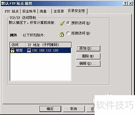 9、 在目录安全性选项卡中可设置FTP服务器的访问控制,允许指定某些IP地址的用户访问,或阻止特定IP地址的访问请求。需注意:若选择授权访问,则列表中的IP地址将被禁止访问;若选择拒绝访问,则列表中的IP地址将被允许访问。具体设置10所示。