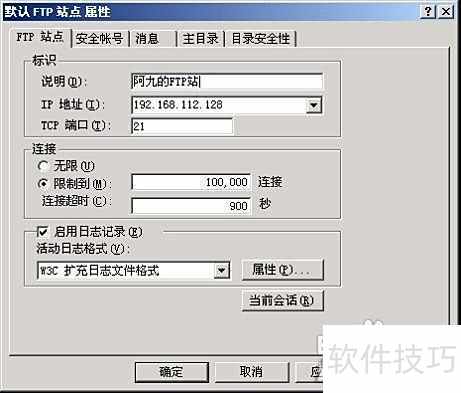 5、 在FTP站点选项卡中,将说明更改为便于识别的名称,例如阿九的FTP站;若主机拥有多个IP地址,需将IP设置为当前主机的某一可用地址,如本例中设为私有IP192.168.112.128;TCP端口保持默认值21不变,具体设置5所示。