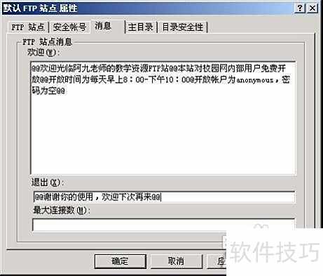 7、 在消息标签页设置FTP服务器登录欢迎语及退出提示,详见图8所示。