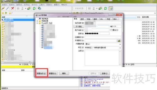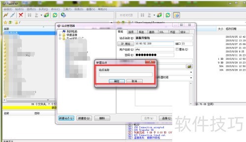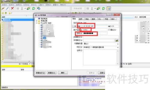 7、 启动FlashFXP,检查服务器连接状态。依次点击菜单栏的站点和新建站点,在下方再次选择新建站点,填写自定义的站点名称,输入服务器IP地址、用户名及密码,确认无误后点击连接即可完成验证。