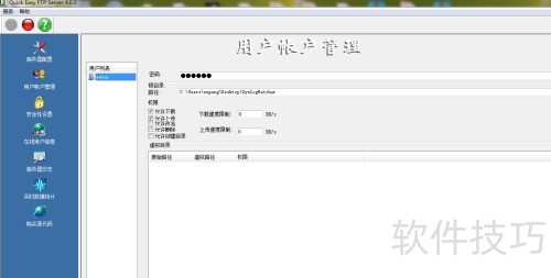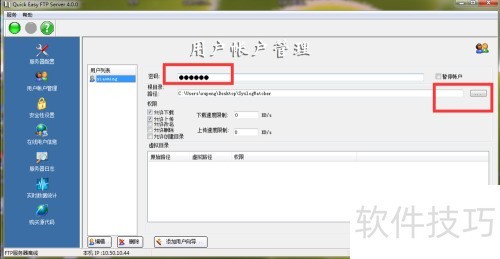 5、 点击新增用户,在左侧输入密码,并填写FTP目录对应路径。