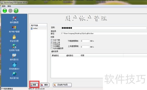 3、 为允许用户访问FTP服务器,需先设置账号信息。请先点击屏幕底部的编辑按钮,添加一个用户名,再配置对应密码。