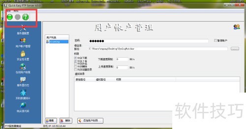 1、 启动Quick Easy Ftp Server后,界面旁的指示灯呈绿色,表示当前处于待命状态。一旦成功开启FTP服务器,指示灯颜色将由绿转红,表明服务器已正常运行并开始提供服务。