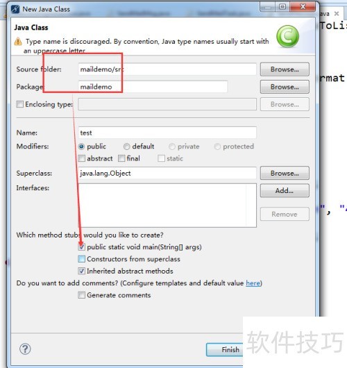 2、 为项目设定简洁名称,并创建一个用于测试的类文件。