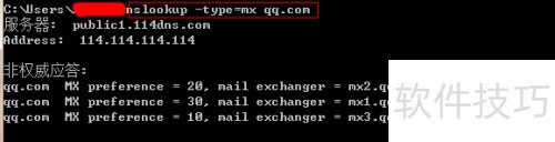 4、 完成设置后,在命令提示符输入nslookup -type=mx qq.com进行测试,检查返回结果是否正确,确保解析功能正常运行。