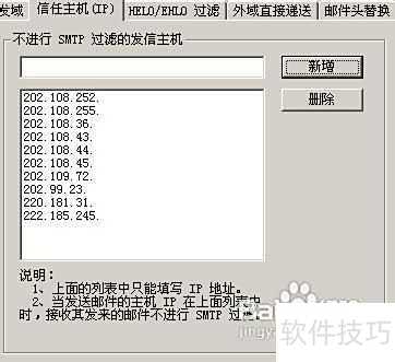 11、 进入系统设置中的SMTP配置,找到信任主机或无需过滤SMTP的发件主机选项,添加指定的IP地址段,确保来自sina.com、163.com、souhu.com等邮箱的邮件不会被系统误判或拦截,保障邮件正常接收。