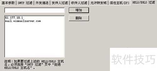 9、 进入系统设置中的SMTP配置,选择HELO/EHLO过滤,填入自身主机名与IP地址,通常冒用此类信息的多为垃圾邮件来源,需重点识别与拦截。