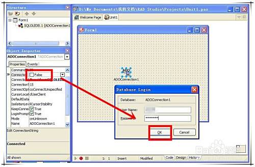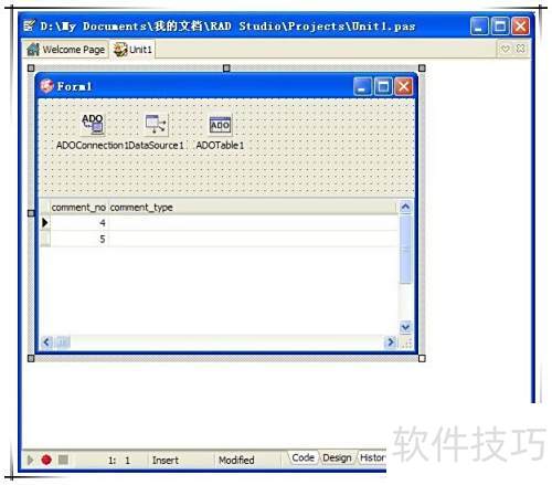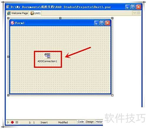 3、 在窗口中双击ADOConnection控件,添加一个名为ADOConnection1的实例。