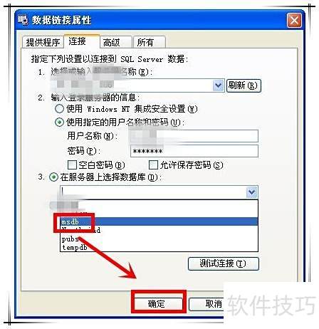 6、 在连接选项卡的服务器名称下拉列表中,会显示当前局域网内可用的SQL Server数据库,可根据需求选择,也可手动输入数据库IP地址进行连接。