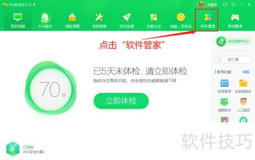 6、 可借助第三方工具如360安全卫士,进入其软件管家功能模块进行操作。
