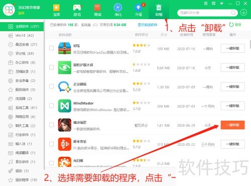 7、 打开360软件管家,切换至卸载选项,勾选目标程序后,点击一键卸载完成操作。