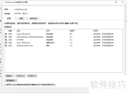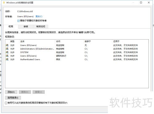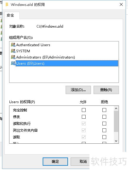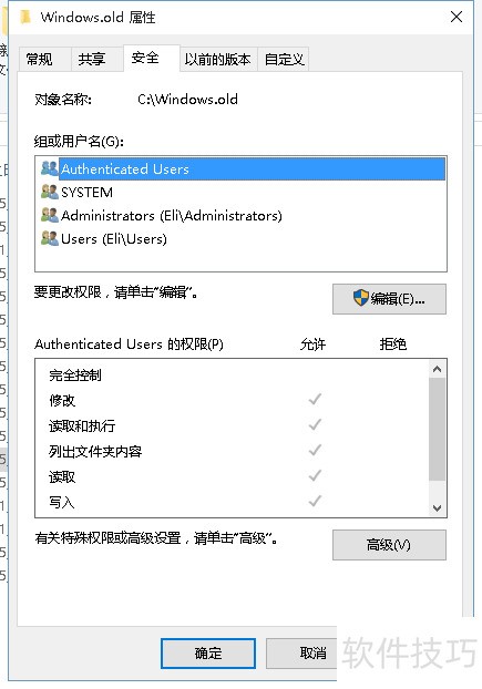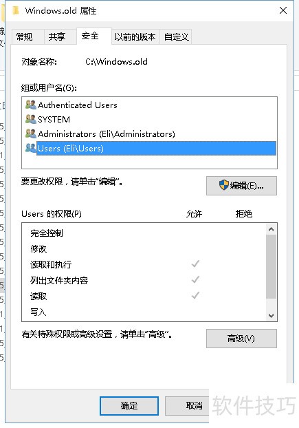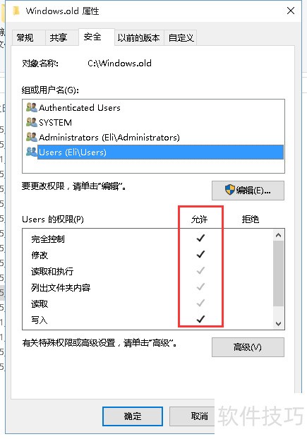4、 所示,返回安全选项可发现当前用户已完全控制该文件夹,尝试删除;若无法删除,重新进入安全选项并点击高级设置进行调整。
