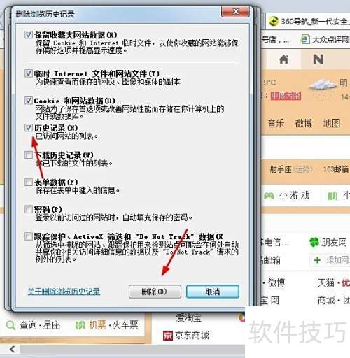 9、 点击删除后,在弹出窗口中勾选历史记录选项,然后确认删除,操作中箭头所示。