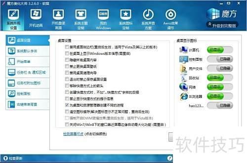 1、 下载魔方美化大师3.2.6.0版本,安装后启动软件,界面将显示(1)所示。