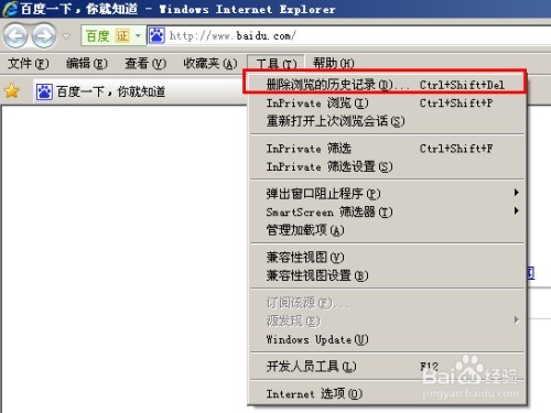 1、 在IE浏览器中,点击菜单栏的工具,选择删除浏览的历史记录即可清除历史数据。