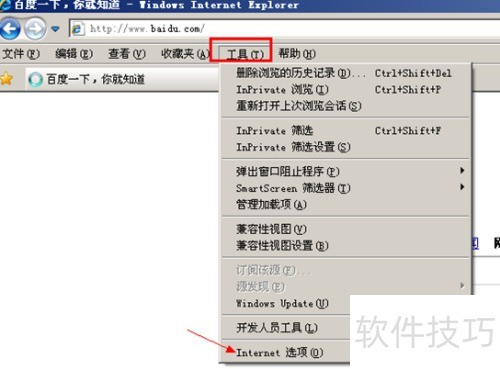 3、 启动IE浏览器,点击工具菜单,选择Internet选项,操作界面所示。