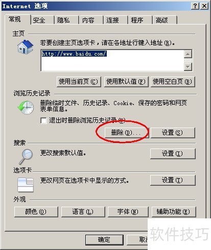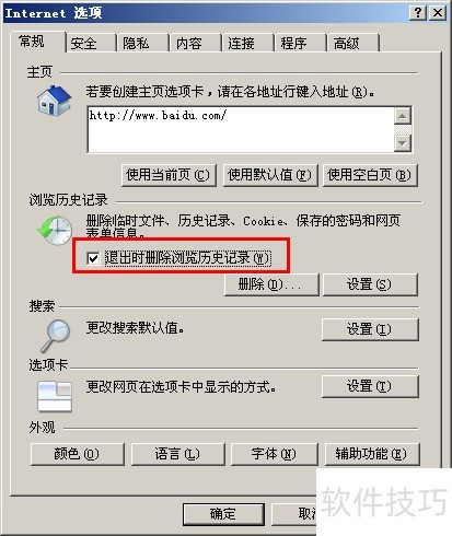 5、 在IE选项的常规设置中,进入浏览历史记录部分,勾选退出时删除浏览历史记录,此后每次关闭IE浏览器都会自动清除历史记录。