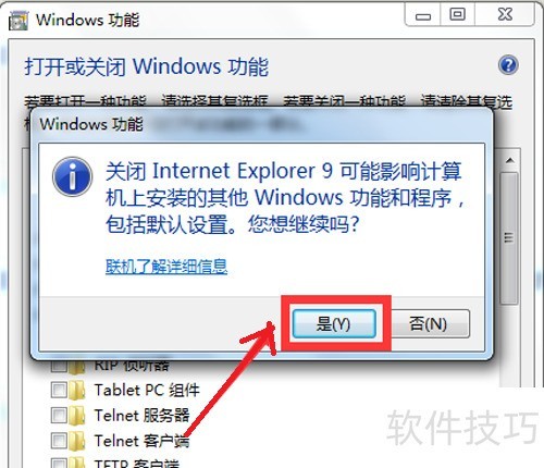 4、 取消勾选Internet Explorer 9之后的选项,并在弹出的提示框中点击是确认操作。