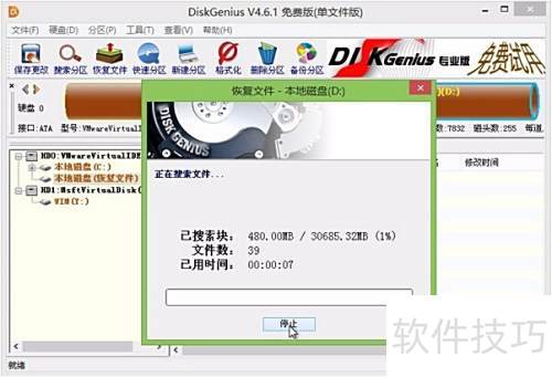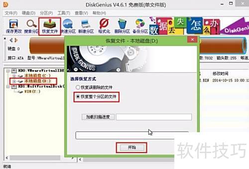 3、 在DiskGenius界面中,选中需要恢复数据的分区,点击恢复文件功能,选择恢复整个分区文件,随后按下开始按钮,即可启动分区文件的完整恢复过程。