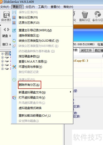 4、 点击硬盘并删除所有分区。