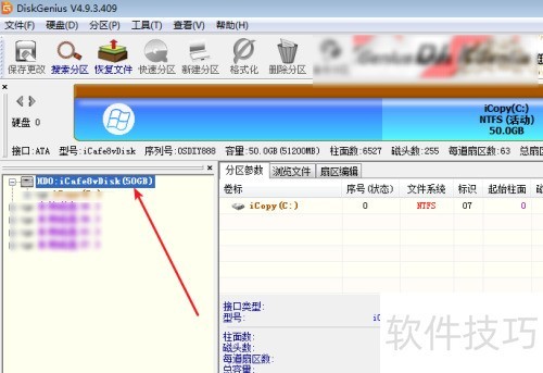 3、 启动DiskGenius后选择目标硬盘,若硬盘已分区则继续操作,新硬盘可跳过此步骤及后续两步设置。