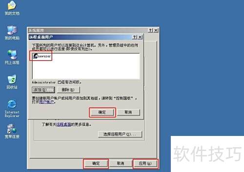 7、 发现远程用户显示newuser,依次点击确定、应用和确定,完成远程桌面配置,现在测试是否能够成功登录。