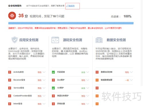 4、 可在线查阅安卓应用安全检测报告,并支持报告下载。