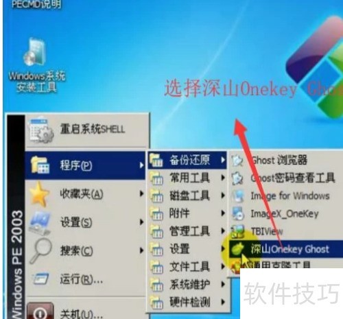 3、 进入PE系统后,点击开始菜单,找到程序中的备份还原功能,选择深山Onekey Ghost即可,操作步骤所示。