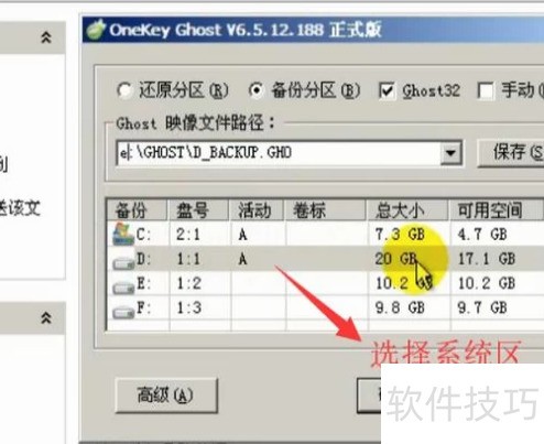 4、 随后将出现OneKey Ghost配置窗口,所示,先选定需备份的分区,再选择目标系统盘符进行操作。