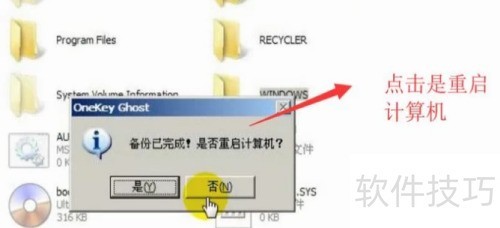 7、 进度条完成后,系统将提示备份成功并询问是否重启,点击是即可,所示。