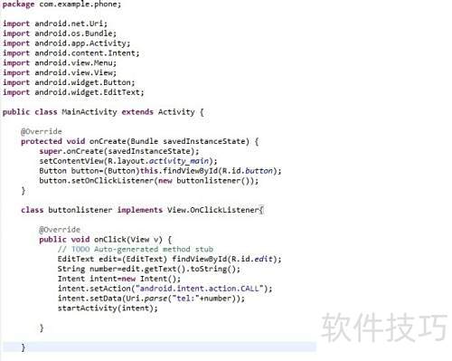 14、 数字4所在行通过Intent设置点击事件的响应操作,其中android.intent.action.CALL用于触发系统电话拨号功能,实现拨打电话的启动。