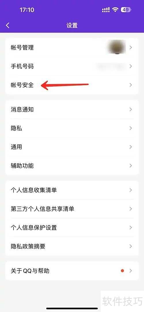2、 打开手机QQ,进入设置,选择帐号安全选项。
