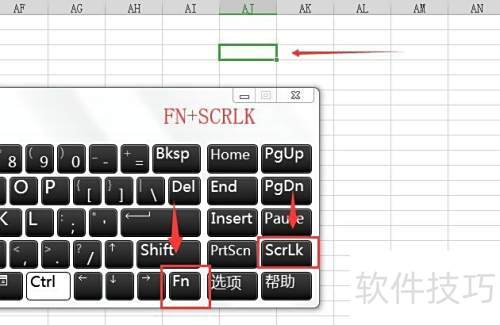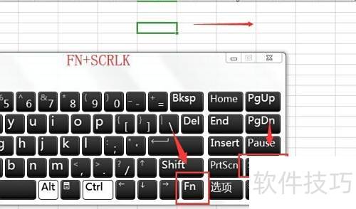 5、 在Excel中使用翻页功能时,首次按下Fn+ScrLk键会导致光标向右移动一格,具体效果所示。
