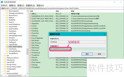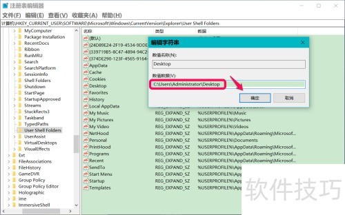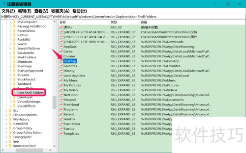 6、 将User Shell Folders中Desktop的字符串值修改为目标路径即可完成设置。