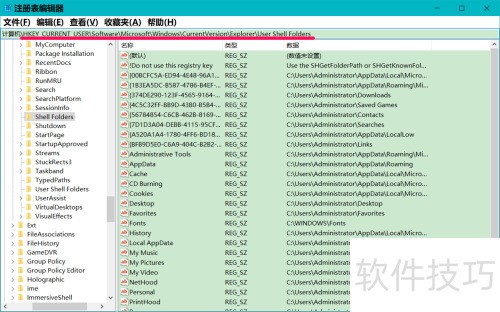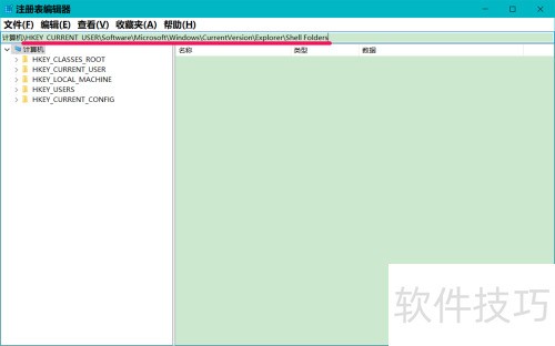 8、 将HKEY_CURRENT_USERSoftwareMicrosoftWindowsCurrentVersionExplorerShell Folders这一注册表路径复制到注册表编辑器的地址栏中,可快速定位该配置项,便于查看或修改当前用户下与Windows资源管理器外壳文件夹相关的设置信息,操作时需谨慎避免误改关键参数。