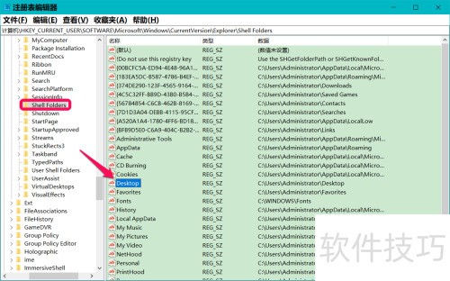 9、 粘贴后按回车键,进入Shell Folders,于右侧窗口中找到Desktop项,双击左键即可定位。