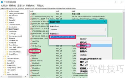 10、 在弹出的编辑字符串窗口中,右键单击Desktop的数值数据,选择复制,随后将内容C:UsersAdministratorDesktop粘贴至记事本中保存备用。