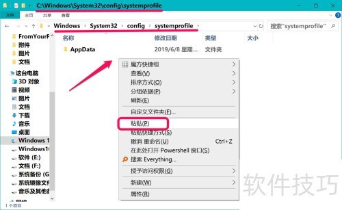 21、 进入C盘Windows系统文件夹下的system32config目录,找到systemprofile,右键空白区域选择粘贴即可完成操作。