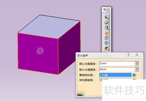 6、 若仅选取图1中的两个面并确认,2所示即可查看相应效果。至此,盒体工具的内外厚度设置及面的移除操作已介绍完毕。