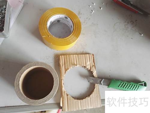 2、 将废纸皮垫于胶带纸芯下方,用美工刀沿纸芯边缘裁出圆形,作为自制工具盒的底座。