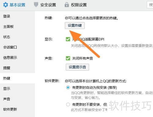 在QQ中设置热键,需先点击左下角设置,进入基本设置后选择热键选项,点击设置热键并按需求进行配置即可完成。