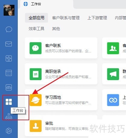 1、 在企业微信左侧栏,点击工作台进入功能页面。