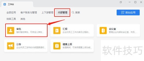 2、 进入工作台,依次选择内部管理、审批功能。