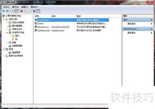 5、 注销当前的Administrator账户,使用你的用户名重新登录Windows 7系统,进入桌面后打开计算机管理器,在其中找到并禁用Administrator账户。